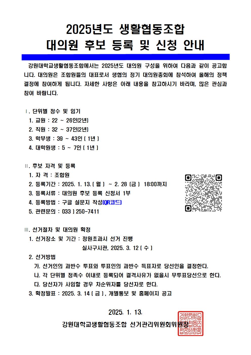 강원대학교생활협동조합에서는 2025년도 대의원 구성을 위하여 다음과 같이 공고합니다. 대의원은 조합원들의 대표로서 생협의 정기 대의원총회에 참석하여 올해의 정책결정에 참여하게 됩니다. 자세한 사항은 아래 내용을 참고하시기 바라며, 많은 관심과 참여 바랍니다.